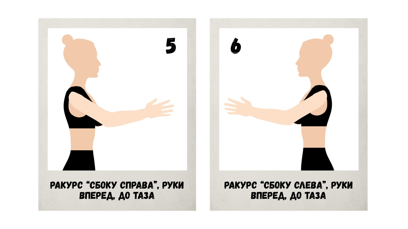 5 и 6. Ракурсы "сбоку справа" и "сбоку слева" (до таза), руки вперед