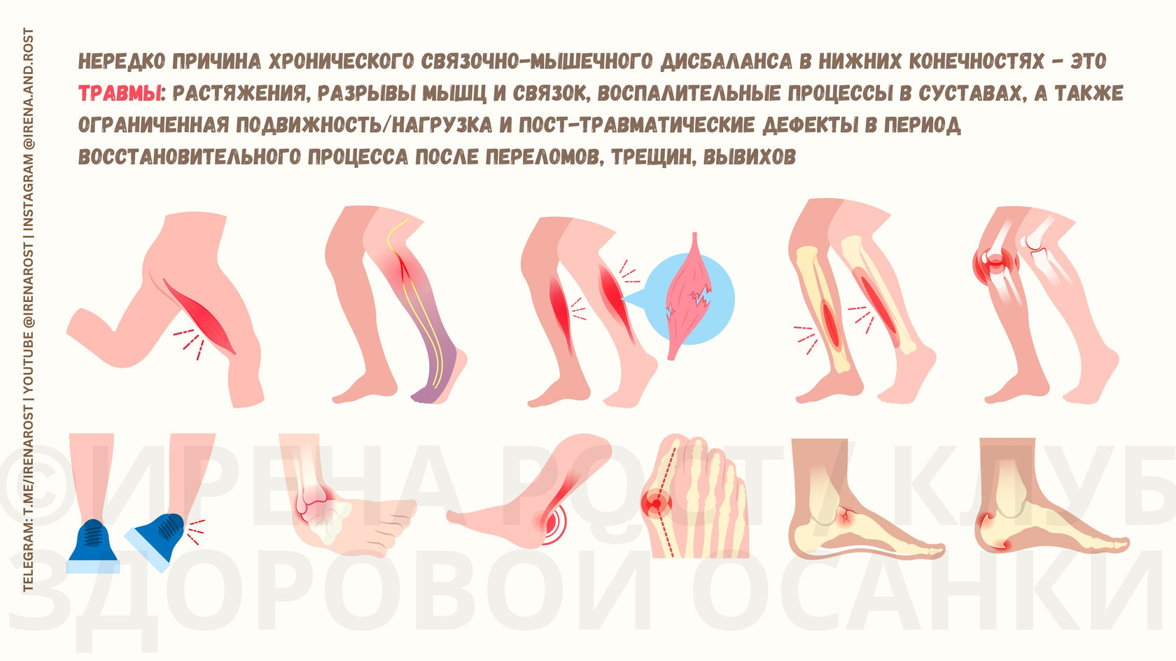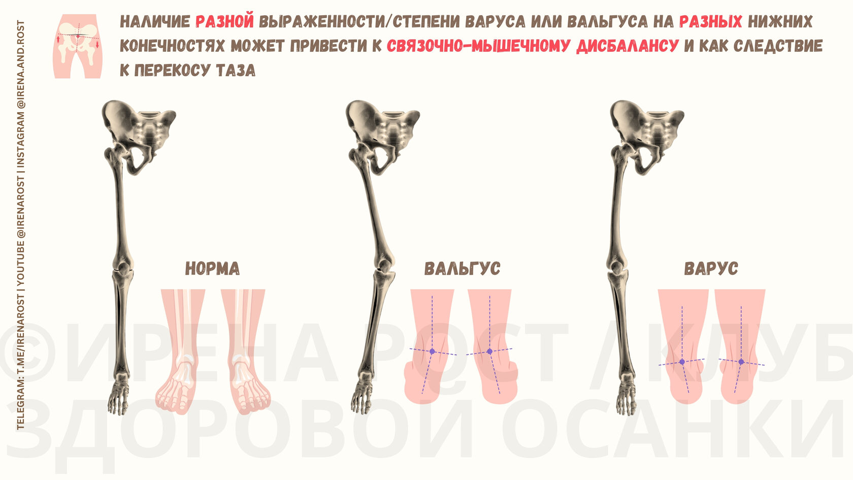 ПРИЧИНА 1. РАЗНИЦА ИЗ-ЗА ХРОНИЧЕСКОГО СВЯЗОЧНО-МЫШЕЧНОГО ДИСБАЛАНСА НИЖНИХ КОНЕЧНОСТЕЙ (если по анализу рентгена нет значительной разницы в длине именно костей ног). Хронический связочно-мышечный дисбаланс (это нередко следствие образа жизни, наличие неравномерно выраженного на обеих ногах варуса, вальгуса, плоскостопия, полученной некостной травмы), при нем длины костей нижних конечностей одинаковы или разница незначительна (до 1 см суммарно). Если сделали рентген-снимок нижних конечностей, но расчеты в разнице длины костей не приведены (в заключении их не прописали), но при этом согласно предварительным замерам ноги разной длины, - нужно уточнить нет ли разницы именно в костях. Если нет - значит, разница длин ног за счет связочно-мышечного дислабанса, который можно скорректировать ЛФК и измененным образом жизни. О стельках при наличии такой причины - в отдельном блоке текста ниже.