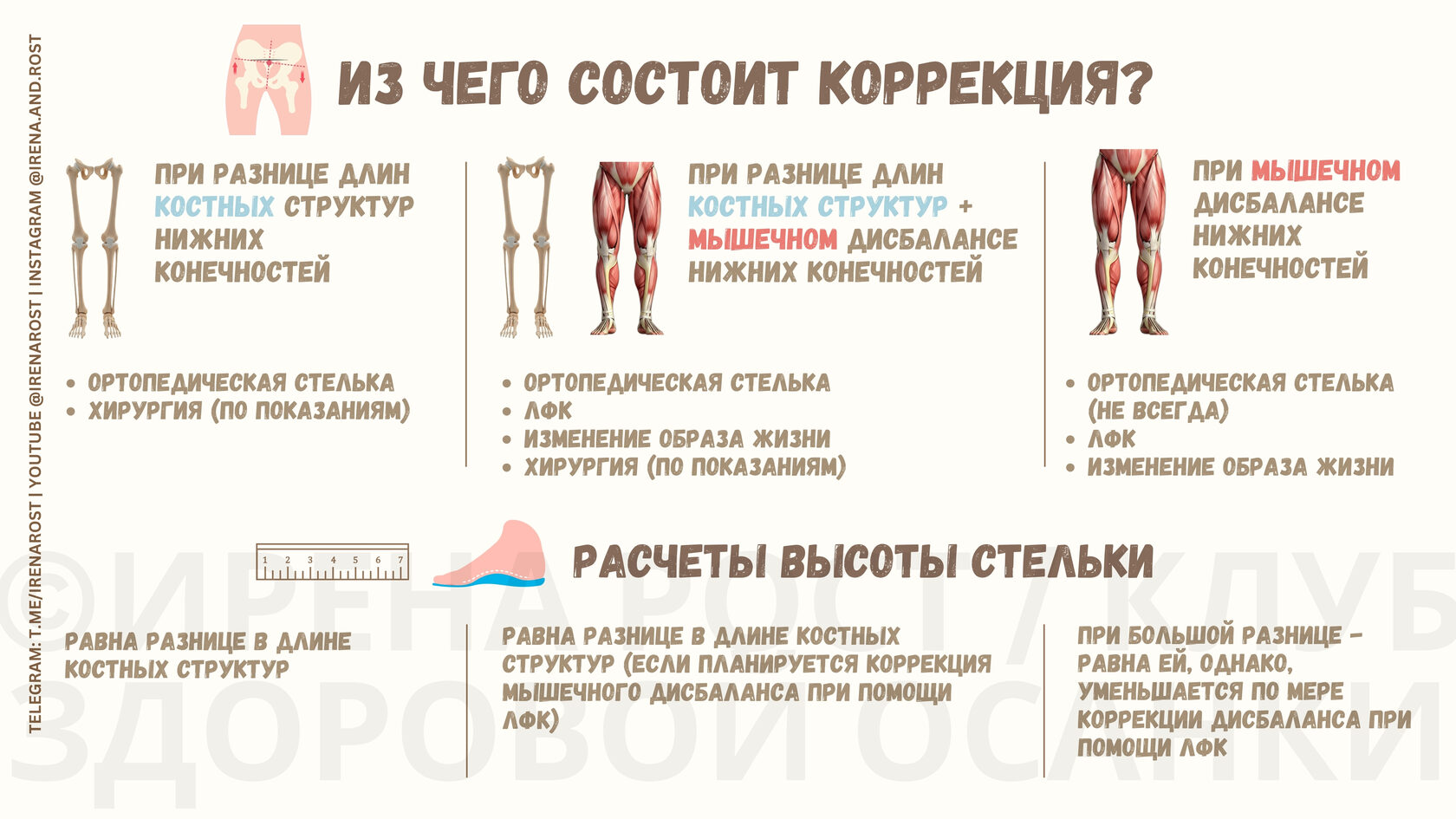 ПРИЧИНА 3. РАЗНИЦА В ДЛИНЕ КОСТЕЙ + СВЯЗОЧНО-МЫШЕЧНЫЙ ДИСБАЛАНС НИЖНИХ КОНЕЧНОСТЕЙ. Это сочетание двух факторов. В случае с подтвержденной разницей в костях ног - прохождение ЛФК нужно совмещать с ношением стелек/стельки, покрывающей только разницу в костях, даже если фактическая разница в длине ног при осмотре больше.