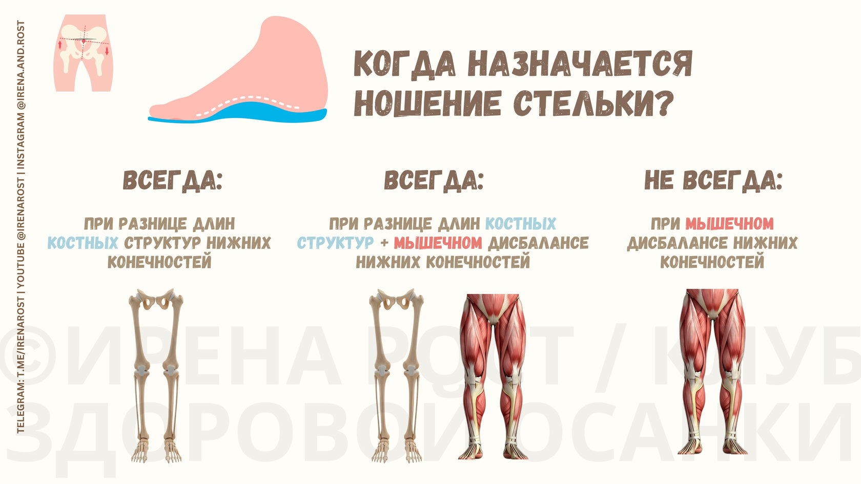 Также: если разница не в костях ног, а причина в мышечном дисбалансе (до 2 см), - ношение стелек при прохождении программы коррекции может быть нежелательным.