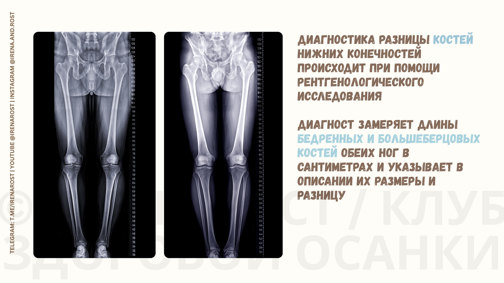 - Если разница в длине ног не подтверждена именно разницей в костях, - значит, разница в связках/мышцах. Логика довольно проста и подтверждается рентгеном ног и расчетом длины костей.
