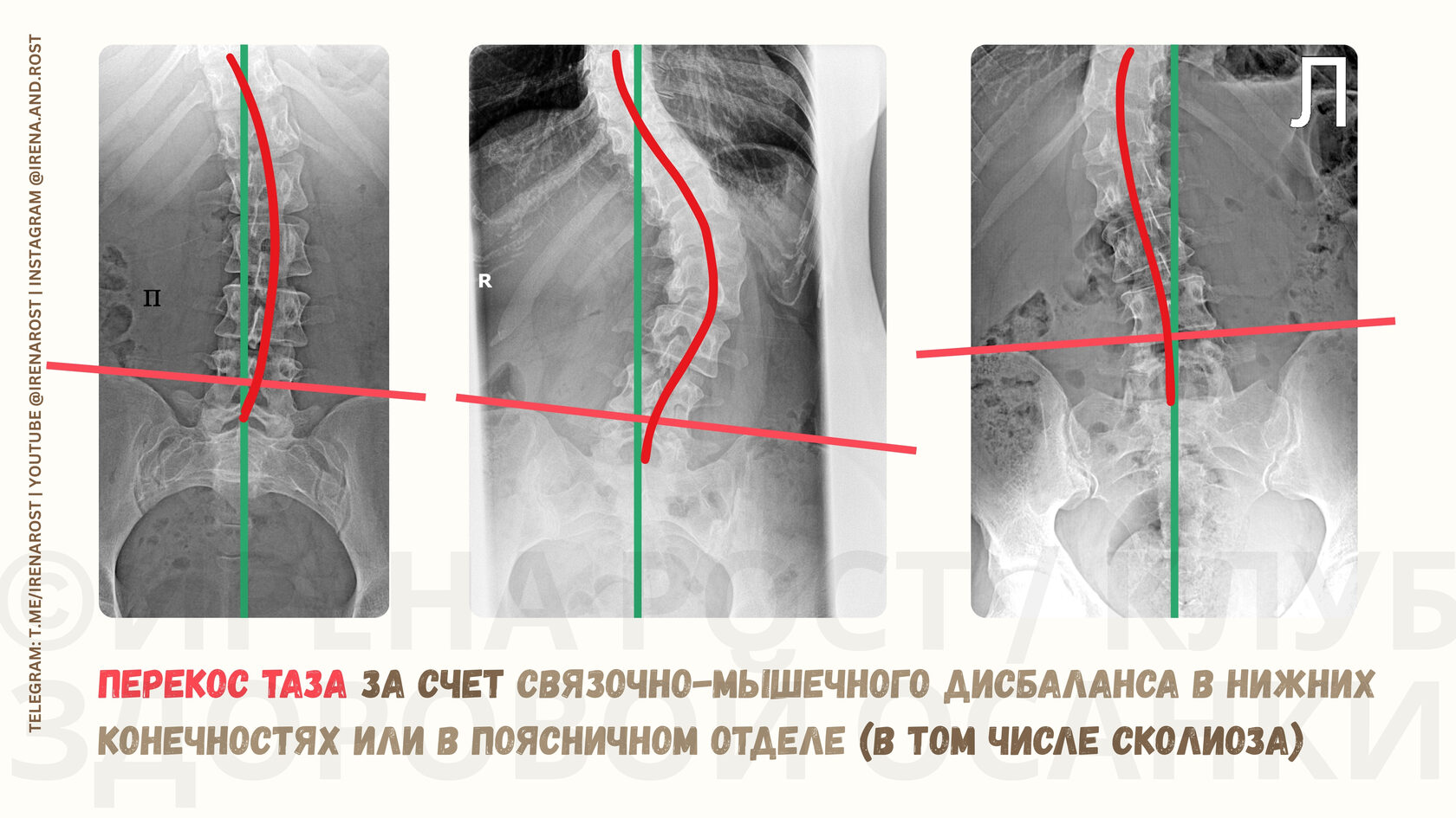 - Если при перекосе таза разница в длине ног отсутствует, а степень сколиоза мала, причина может крыться в связочно-мышечном дисбалансе поясничного, пояснично-крестцового, тазового отделов. Работа в симметричных правильных и регулярных тренировках этот дисбаланс устранит.